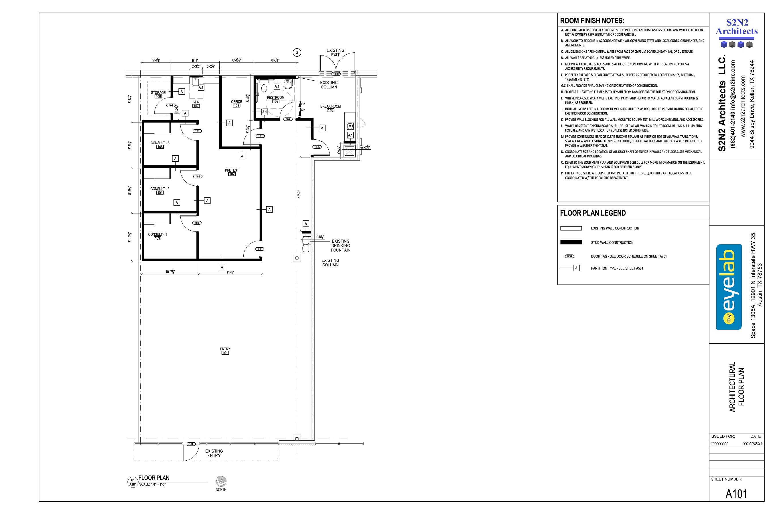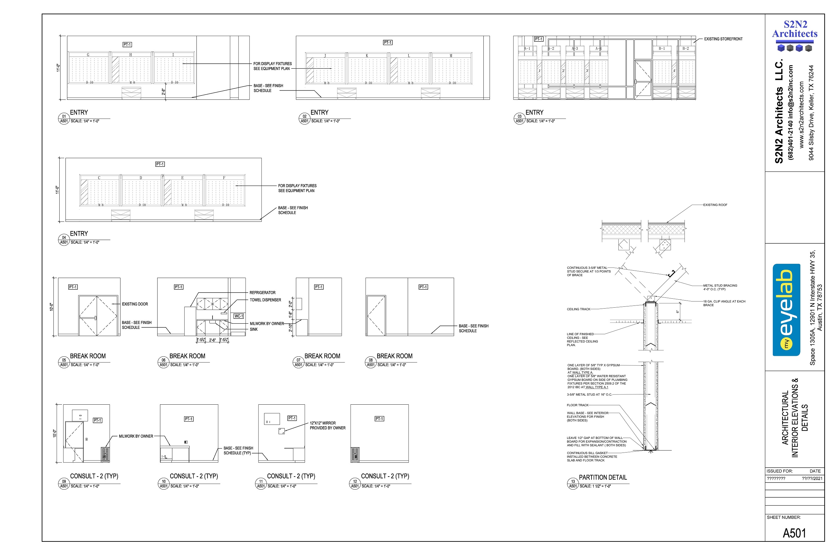 Designed a tenant buildout for My Eyelab franchise in Austin, Texas. The project covered area is 2328 sq. ft. and it includes display area, 3 consultation rooms, office, storage, break room and restrooms.